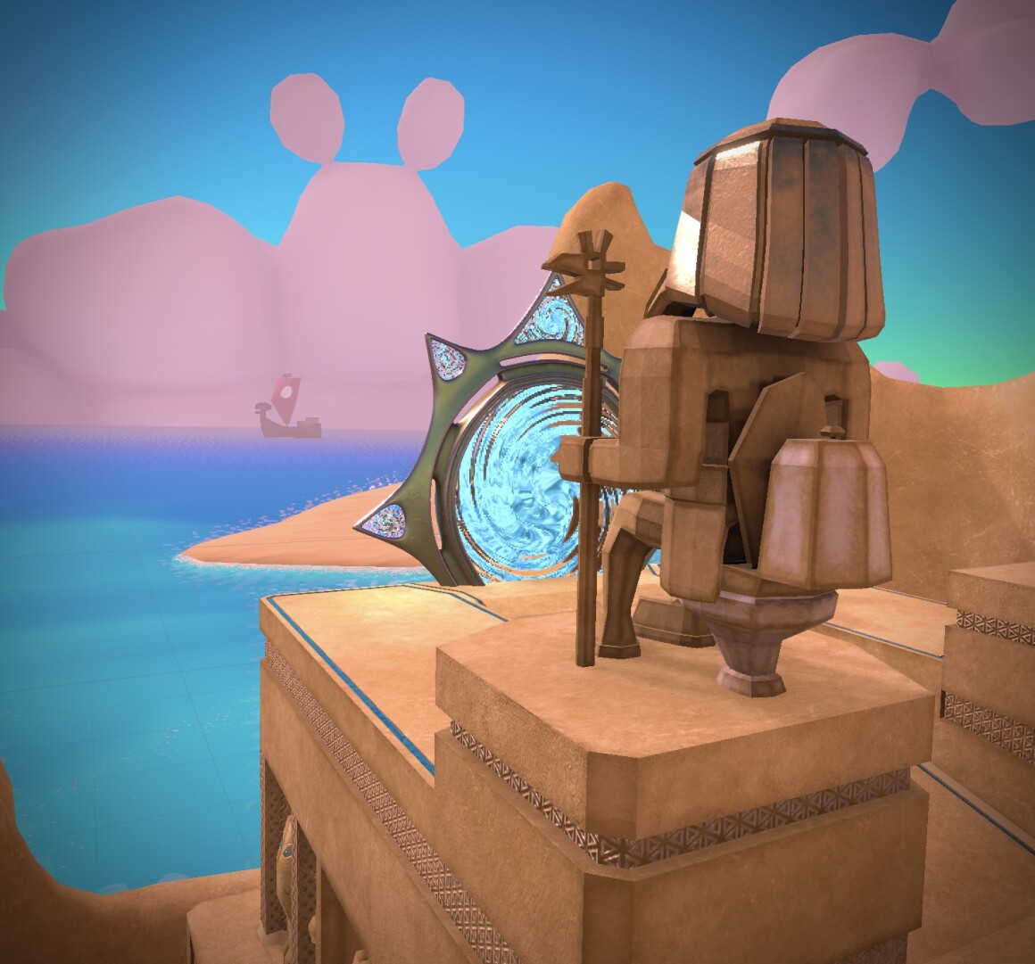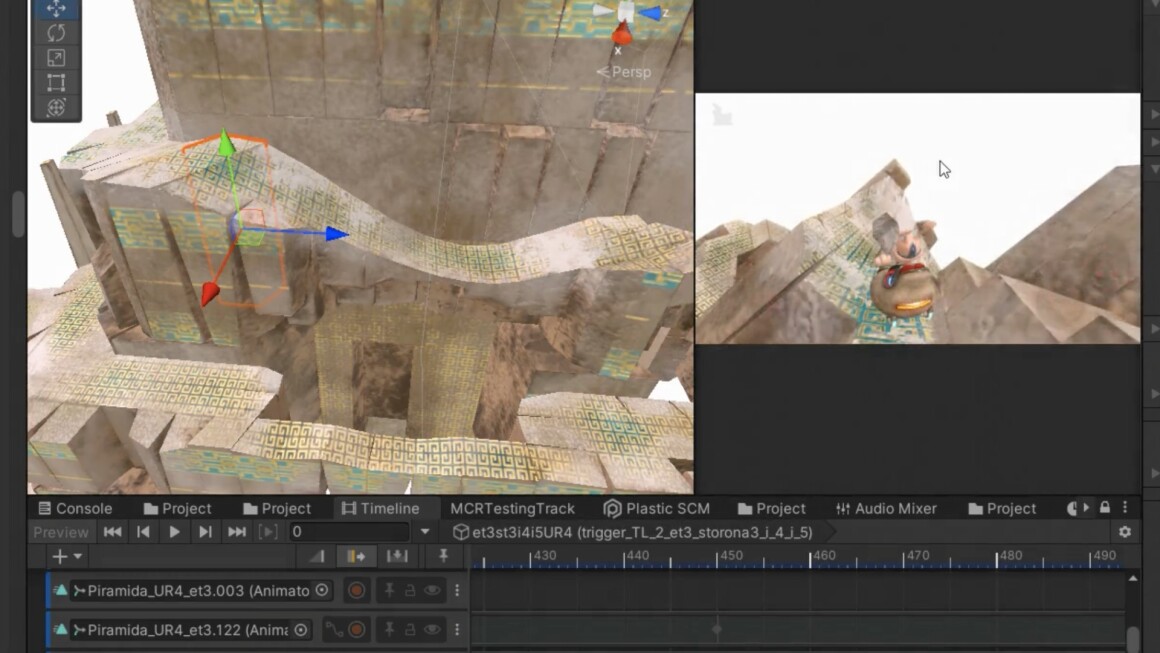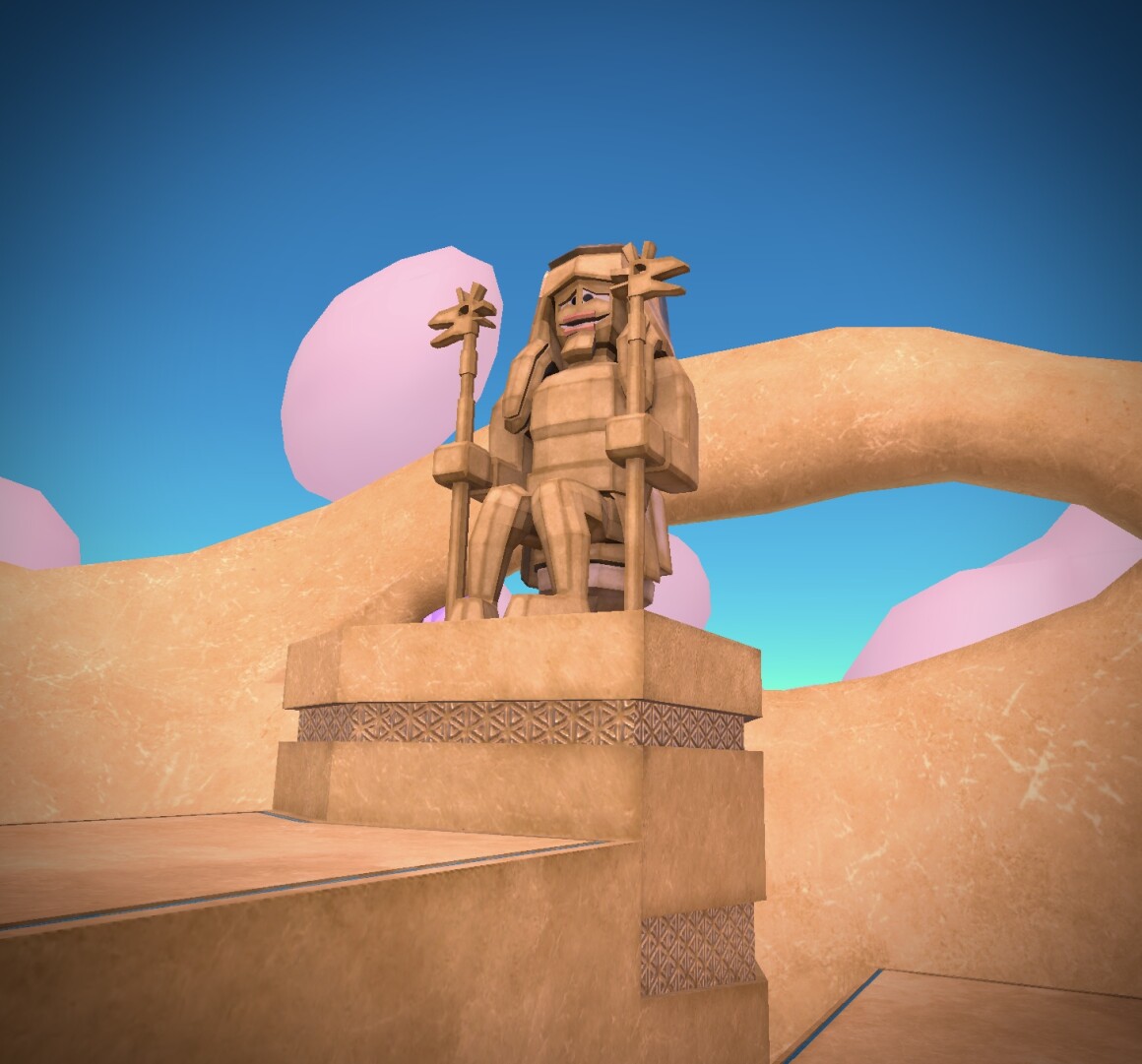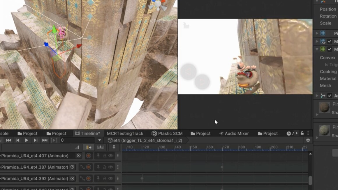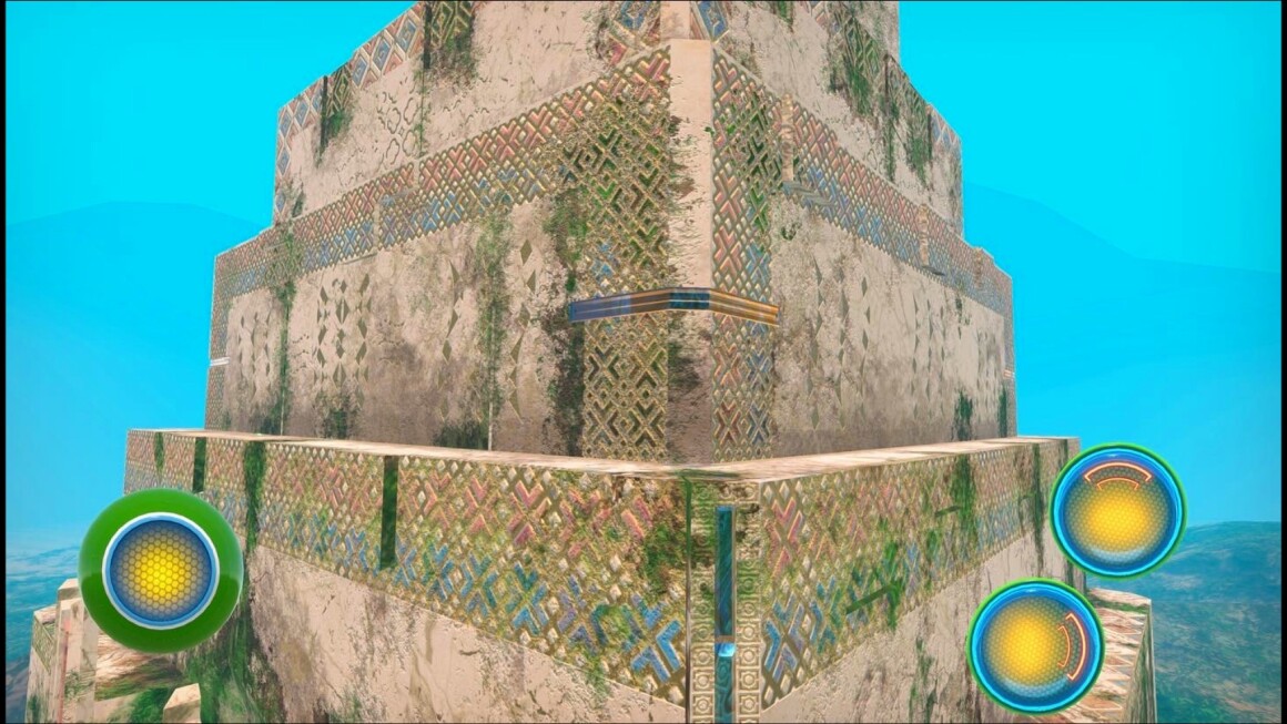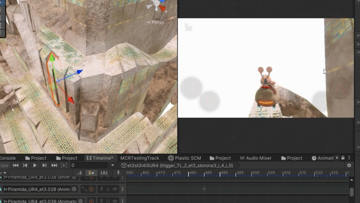 Пирамида была самостоятельно собрана из множество 3D деталей c возможностью её разрушения. Для обрушения пирамиды анимировалась каждая деталь, анимация ручная. Текстуры пирамиды рисовались мной тоже ручным способом мышкой. Детализация текстур на вырост, что позволяет портировать и для ПК и для приставок. Внутри пирамиды расположена гигантская статуя, которую возможно увидеть в процессе прохождения :).